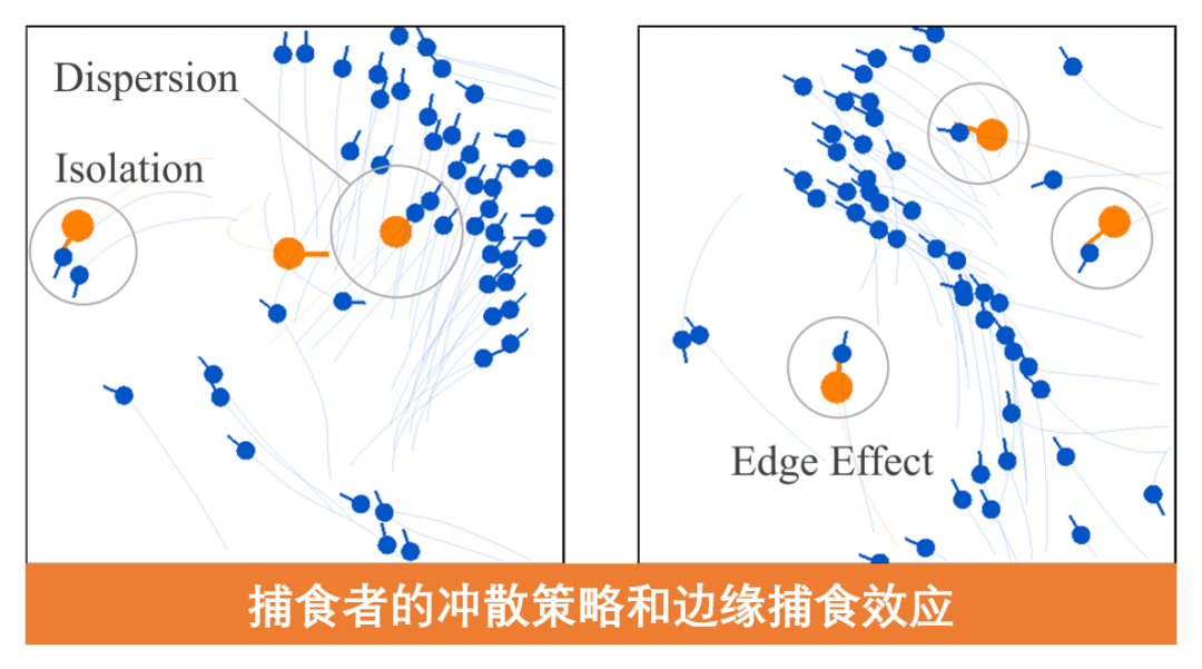 此外,我们还观察到了捕食者的冲散策略 (dispersion tactic) 和边缘捕食 (edge effect) 效应。这些行为表明,当捕食者试图选择最佳的攻击目标时,追捕那些远离群体的猎物可能会减轻困惑效应,突显了捕食者在从一群猎物中选择最佳目标时所面临的挑战。