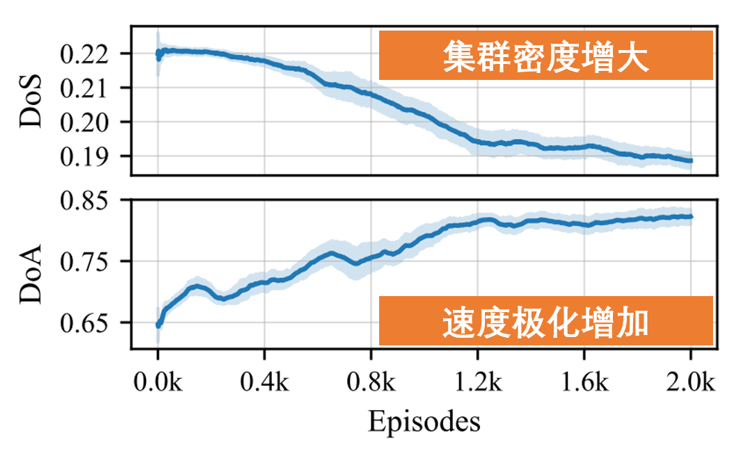通过定量分析,我们发现随着进化的迭代次数的增加,群体的稀疏度(DoS)逐渐减小(即密度逐渐增大),同时群体的同向性(DoA)逐渐增大,这些特征暗示着集群行为的涌现。