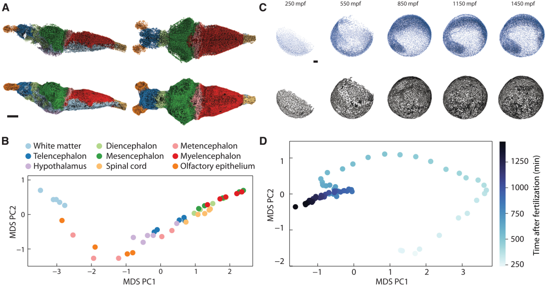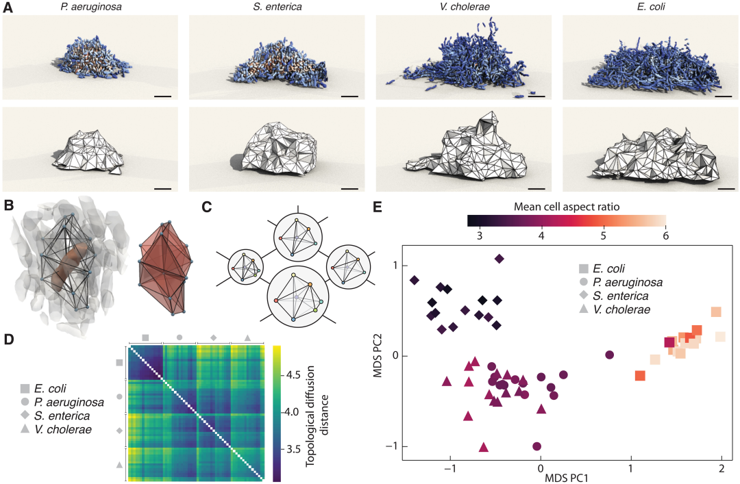 文章通过使用Delaunay三角剖分的统计特性,引入一种数学框架,用于测量一般三维点云之间的拓扑距离,由此产生的与系统无关的度量标准揭示了细菌生物膜之间以及斑马鱼脑区域之间微妙的结构差异,并恢复了胚胎发育的时间顺序。