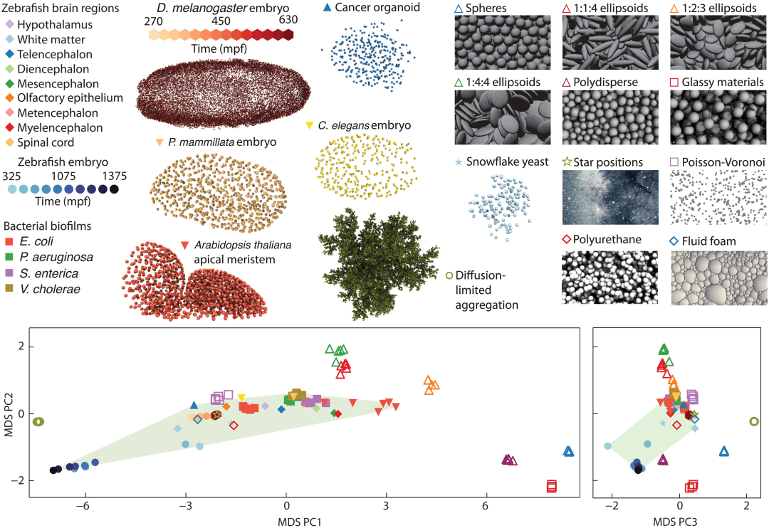 作者应用这一度量标准构建了一个通用的拓扑图谱,包括细菌生物膜、雪花酵母、植物嫩枝、斑马鱼脑组织、器官样体和胚胎组织,以及泡沫、胶体填充、玻璃材料和天体配置。