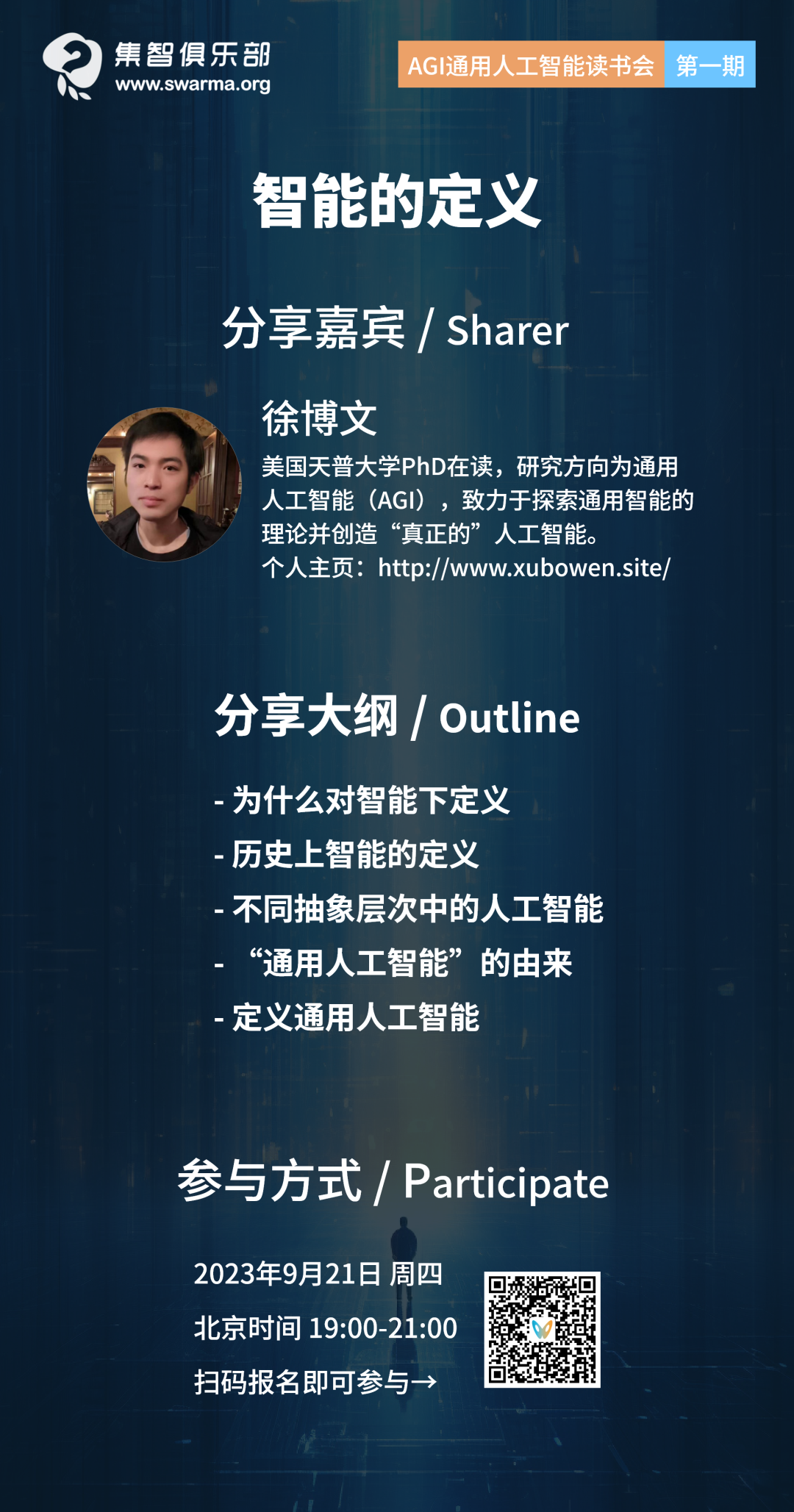 本次分享是系列读书会的第一期分享,将先从智能的定义开始进行讨论。希望通过对智能的定义以及通用人工智能由来的讨论,帮助参与者对“通用人工智能”建立初步的认识。