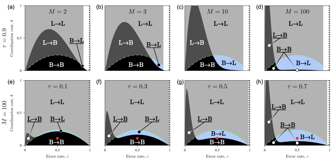 图3. 保留其简单功能的基质上涌现出的复杂表型的演化路径。(a-d)随着涌现表型的复杂性增加(M=2,3,10,100),镜像对称性的破坏变得不可避免。(e-h)探讨一个复杂表型(M=100)逐渐增加使用神经基质的时间比例。这类似于高级脑功能逐渐组装并取代相同神经基质中更简单的计算的发育情况。通过这个过程,红点处的回路将变得侧化。