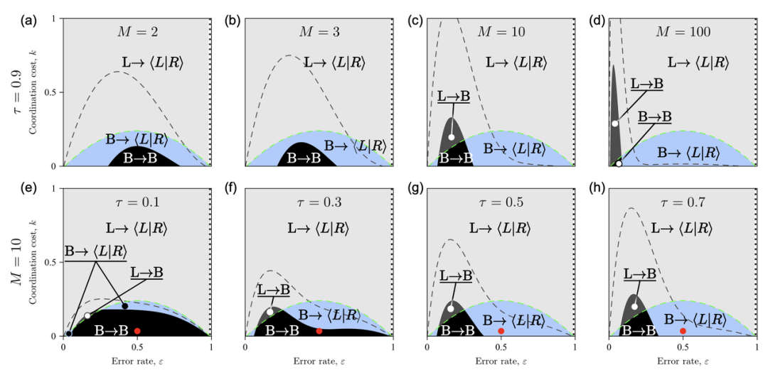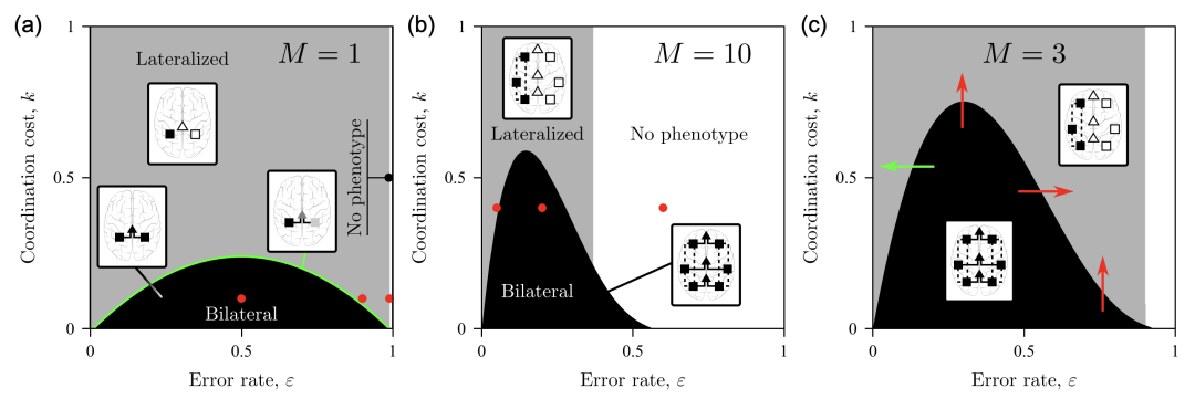 图2. 最优侧化和双侧构型。在白色区域,由于成本太高,永远不会出现寻求的表型;灰色区域更倾向侧化构型;黑色区域更倾向双侧构型。