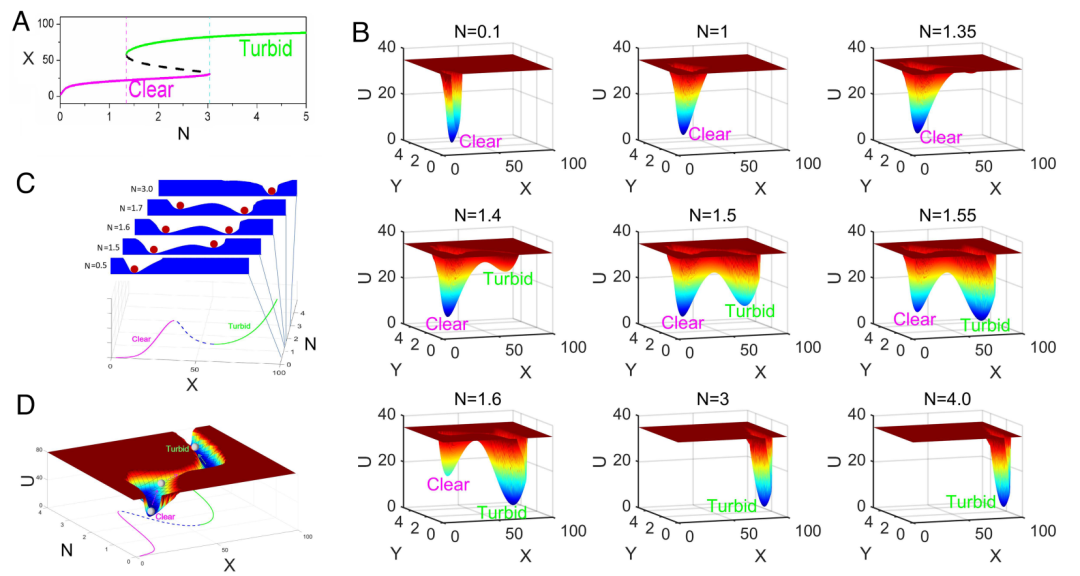 图2.(A)(B)浅湖系统相图。其中X为鲷鱼密度,Y为梭子鱼密度,N为湖水营养水平,U为景观势能;(C)“谷中球”(ball in the valley)概念模型,将两稳态视为两谷地,则可将系统在两稳态间的转变比喻为小球在两谷地间的运动;(D)将势能沿Y方向积分后所得的三维景观图。