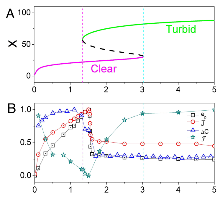 一旦湖水中的营养物质浓度超过某一阈值,藻类就会大量生长,沉水植物消失,湖水从清澈状态转变为浑浊状态,生态系统功能严重降低。实际上当外源营养物达到一定量后,一点点营养物的添加就会引起生态系统结构的重大变化。因而在一定的营养物范围内,清澈和浑浊是双稳态,两种稳态之间的转变可由噪声诱导。