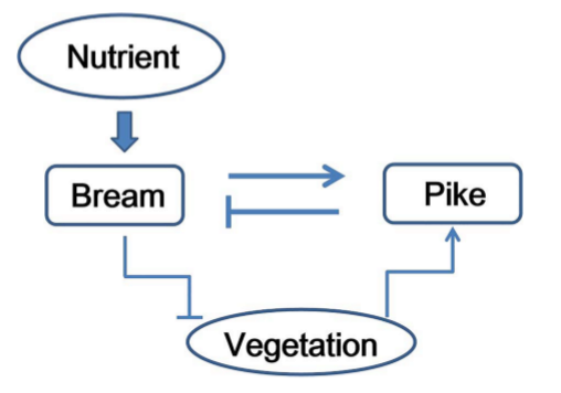 图1.浅湖模型示意图。其中平头箭头代表抑制关系(所指对象为猎物),尖头箭头代表促进关系(所指对象为捕猎者)。浑浊湖水中存在大量鲷鱼和浮游植物,清澈湖水中鲷鱼则相对较少,还存在梭子鱼(以鲷鱼为食)及沉水植物。观察表明,湖水的清澈程度与梭子鱼和鲷鱼的比例密切相关。