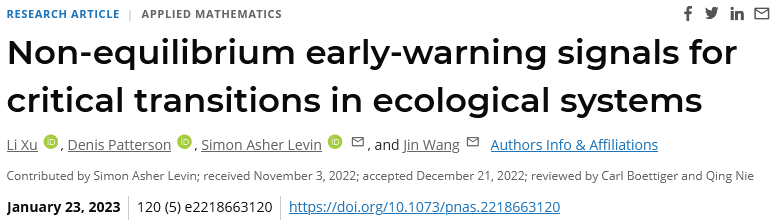 复杂系统可以从一种稳定状态突变到另一种稳定状态,通常称其为临界转变。及早识别转变信号并进行干预,是一个巨大的挑战。美国纽约州立大学石溪分校汪劲教授与中国科学院长春应用化学研究所的徐丽副研究员,世界著名生态学家、普林斯顿大学的Simon Levin教授,以及普林斯顿大学的Denis Patterson博士合作在 PNAS 发文,利用非平衡统计力学的景观-流理论(landscape-flux theory)作为量化生态系统稳定性的框架,并为临界转变提供早期预警信号。