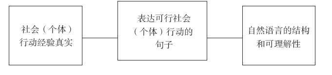 由此可见,用符号系统表达社会行动及相应的个体心灵状态,是社会行动真实性存在(即社会行动普遍可重复)的前提,这个前提对科学真实不是必需的。符号和被表达对象之间的关系只是一种约定,只有该约定被社会普遍接受,通过接收符号进入其他人的心灵状态(或某人对社会行动的想象)才是可能的。这样,我们得出一个重要结论:社会行动的普遍真实性依赖一个指涉社会行动和个体之心灵状态的符号系统的存在,那就是人使用语言。