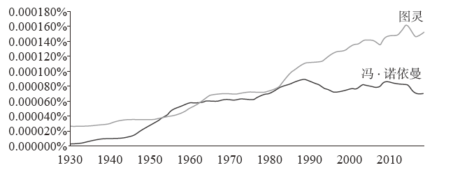 通常认为,图灵做出的重要工作有两个:一是发明图灵机原理,二是提出图灵测试。图灵机就是通用电子计算机,它和冯·诺依曼机等价。图4—3是自20世纪30年代图灵机被提出以来,“图灵”和“冯·诺依曼”对应的英文词在谷歌图书数据库中出现的频率,从中可见,20世纪80年代是一个节点。自此之后,“图灵”的词频一直遥遥领先。这意味着随着电子计算机应用的日益广泛,图灵测试的重要性突显出来,成为当代人关注的问题。