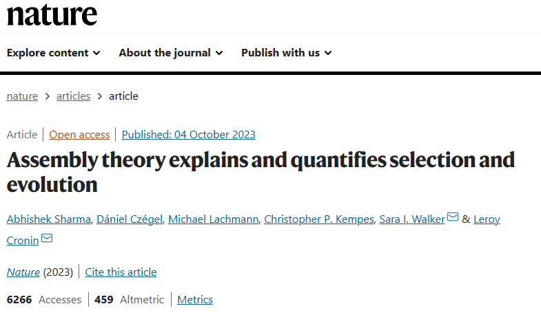 论文标题:Assembly theory explains and quantifies selection and evolution 论文来源:Nature 斑图链接:https://pattern.swarma.org/paper/ff9576ae-630b-11ee-8c61-0242ac17000d 原文链接:https://www.nature.com/articles/s41586-023-06600-9