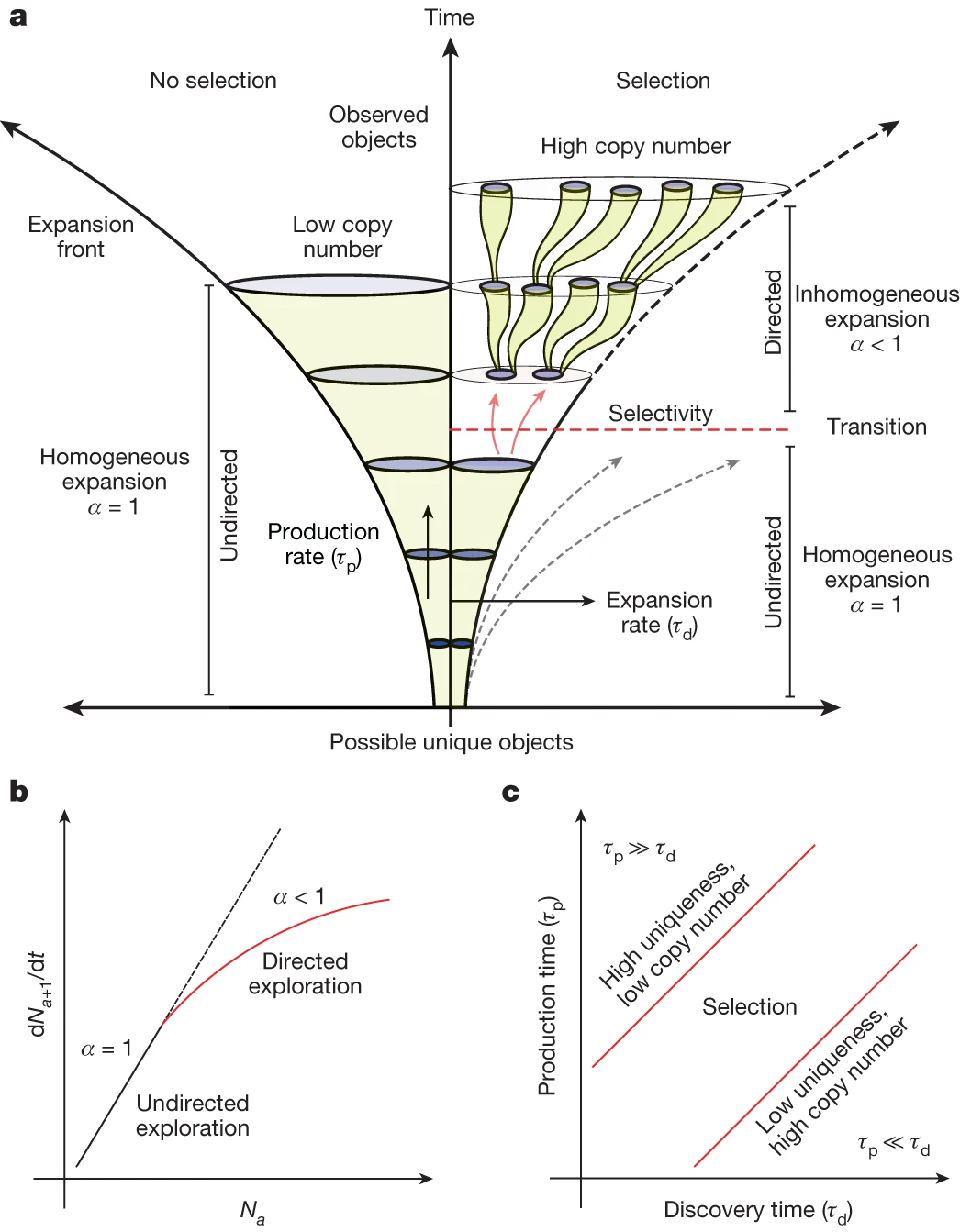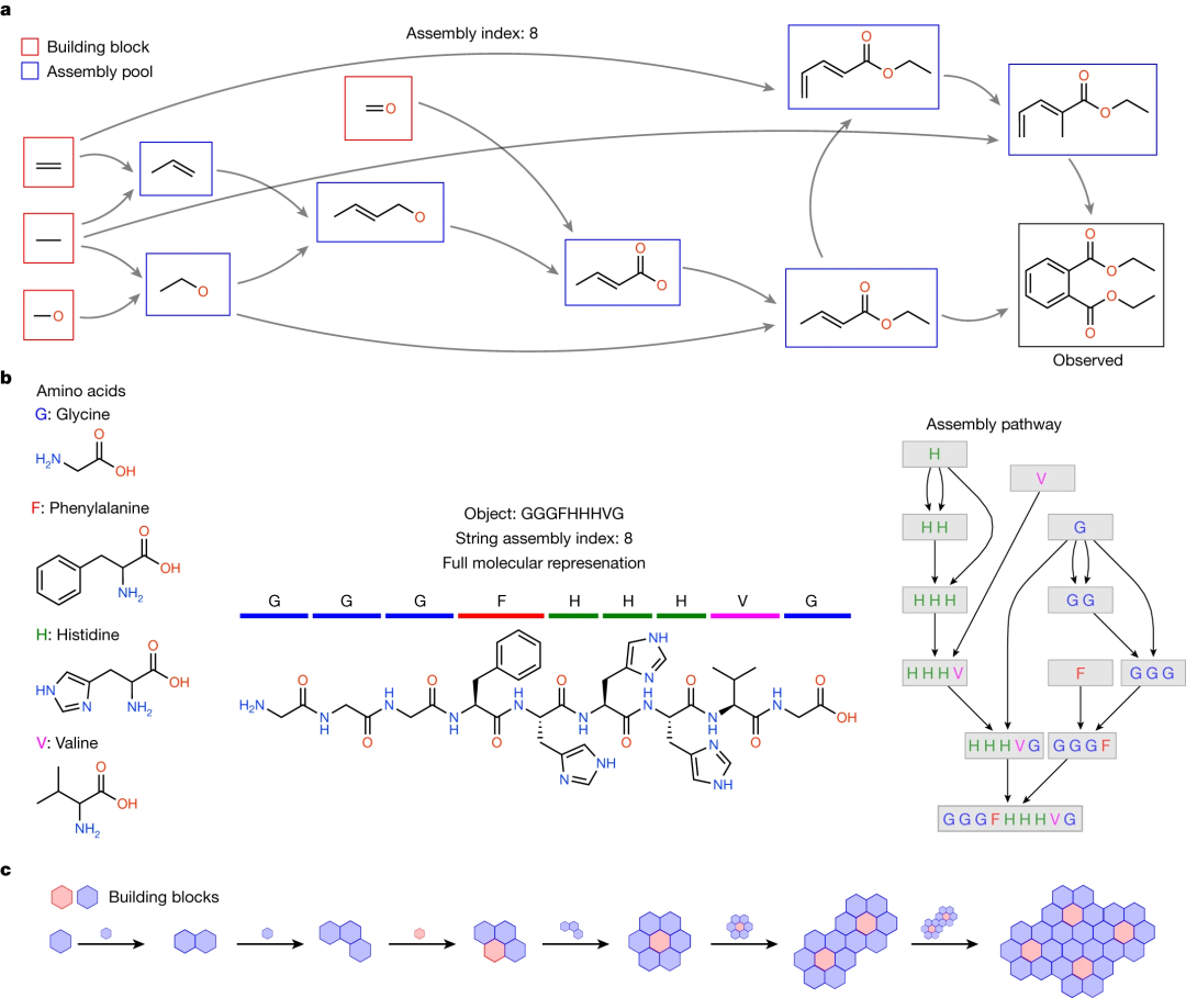 文章提出组装理论(assembly theory, AT)作为一个框架,它不改变物理法则,但重新定义了这些法则所作用的“物体”的概念。组装理论将物体的概念不再看作是点粒子,而是看作是由它们可能的形成历史所定义的实体。这使得物体能够在个体或选定单元的明确边界内显示出选择的证据。