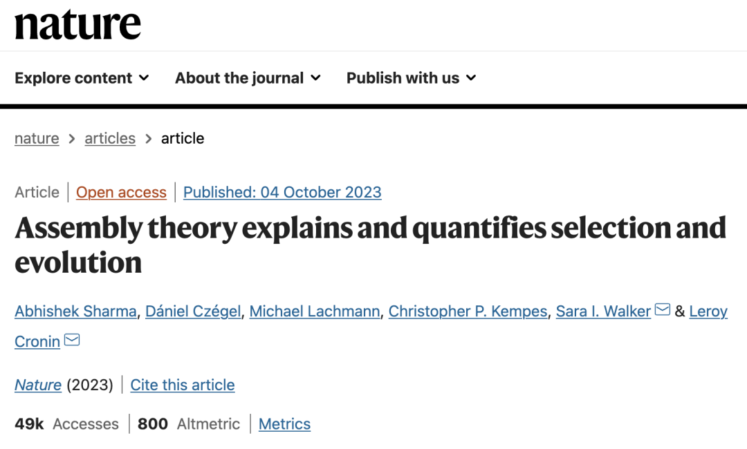 在近日发表于Nature的一项最新研究中,Sharma等[4]提出了他们称为的组装理论(assembly theory)来填补这一空缺,提供了一个框架来统一横跨物理学和生物学中对进化性选择的描述。