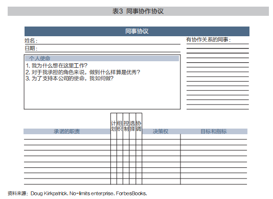 在同事协作原则下,还有把协作关系和职责清晰化的同事协作协议。表3列出了同事协作协议的模板。需要特别指出的是,签署这个协议并不意味着,不在这个协议里的职责,就可以不管了。晨星公司倡导“责任环”(rings of responsibilities)的概念,责任就像是一圈套一圈的同心圆,每个人在岗位上的职责是核心责任,也是能为公司做出最大贡献的地方。但同时,每个人要为公司所有的事情操心。特别是遇到有可能对公司造成损失的事情,任何人都有责任及时通知应该负责的同事,或者在来不及通知以及责任尚不清晰的情况下,临时承担起来,直到由承担该项责任的同事接手。