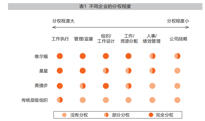 来自哈佛大学商学院的迈克尔·李(Michael Lee)和艾米·埃德蒙森(Amy Edmonson)教授曾经对这三家典型的自组织企业以及传统层级组织的分权程度做了详细的分析,见表1。