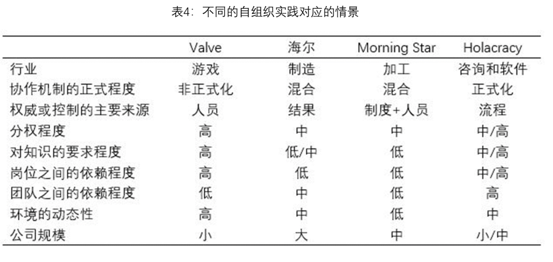管理没有最优,有的是选择。关键的是,需要知道怎么选择。这就需要考察管理实践的情景因素,并试图找到规律性。表4列出了四家不同的自组织所对应的主要情景因素。可以看到,自组织在不同的行业、不同规模的企业、不同知识要求、岗位和团队之间不同依赖程度的情景下都有实践。但是,即使把莱卢在《重塑组织》一书中提到的自组织都包括进来,样本还是有限,尚未发现情景因素的组合和不同机制之间是否存在某种对应关系。对比的结果似乎只能说明,混合式的协作机制有利于自组织做大规模。