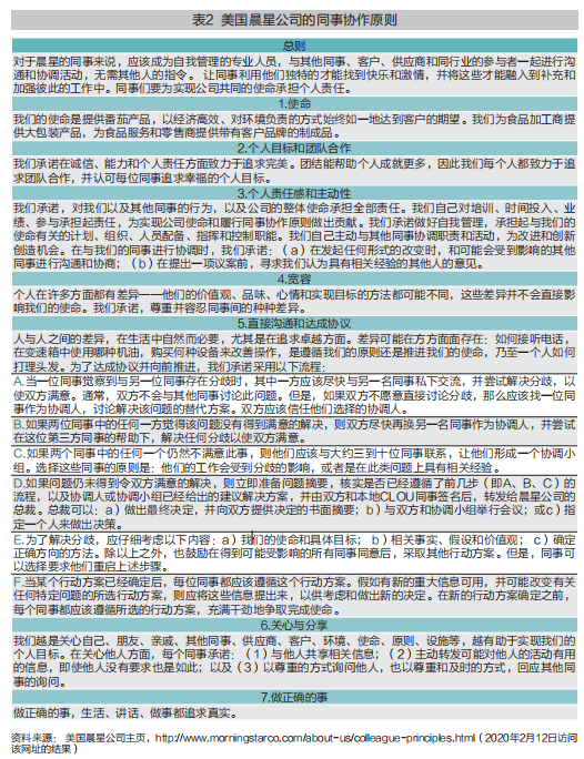 表2是截至目前为止,晨星公司从两条基本原则发展出来的自组织文化体系,即同事协作原则。英文简称 CLOU(Colleague Letter of Understanding),详情见表2。