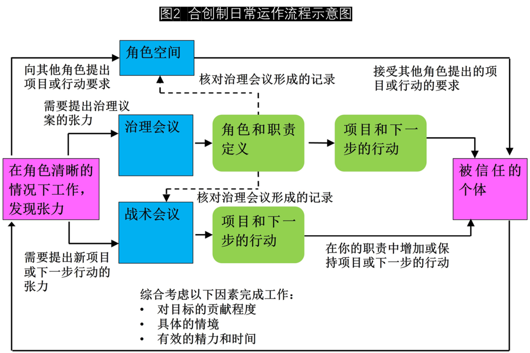 合创制中没有传统意义上的管理者,管理的职责被分散了。如何分散呢?第一,给予角色承担者角色领域内最大的自主权,没有任何人命令他们干什么,但是他们也需要为自己的工作成果负责,也就是自我管理。第二,圈子会议,包括战术(Tactic)会议和治理(Governance)会议。这两种会议是合创制体系中重要的沟通协调机制。圈子会议是非常结构化的,实施的方法在《重新定义管理》,以及《合创制宪章》里面有详细的说明(http://www.holacracy.org/constitution)。图2以两个会议为重点,展示了合创制运作的流程。