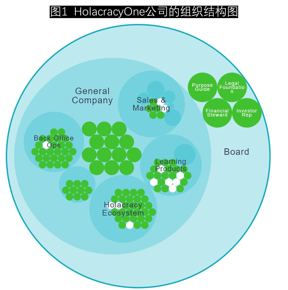 HolacracyOne公司开发和推广合创制,并提供合创制管理咨询和服务。图1中最大的圈子(即根圈)是董事会圈子(Board)。董事会圈子下有一个子圈子:一般公司圈子(General Company Circle)。如果你在电脑上打开该公司的网页,找到图1的结构图,并操作鼠标点击一般公司圈子,就可以进入这个子圈子。这个子圈子下有几个子圈子,分别是销售和市场(Sales & Marketing)、合创制生态系统(Ecosystem)、学习产品(Learning Products)、支持(Back Office)。销售和市场子圈子下又有子圈子。没有子圈子的圈子是角色(Role),是合创制组织结构中的基本单元。感兴趣的读者可以通过阅读《重新定义管理》了解更多的信息。