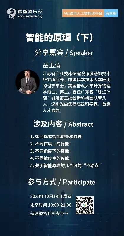 为了深入探讨 AGI 相关话题,集智俱乐部联合集萃深度感知技术研究所所长岳玉涛、麻省理工学院博士沈马成、天普大学博士生徐博文,共同发起 AGI 通用人工智能读书会。读书会从2023年9月21日开始,每周四晚上 19:00-21:00进行,预计持续7-10周。