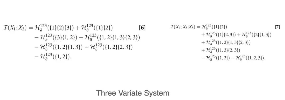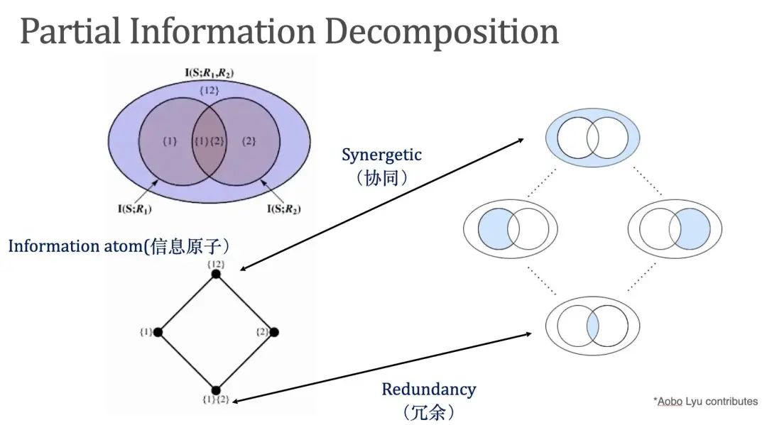 简单说明,在传统的信息分解框架里,我们有多个source,但只存在一个目标(当然存在信息分解框架)。现在要衡量不同source对于target的预测效果(互信息),我们需要将其分解为单个source对于目标的特有信息,任意source组合时其中所有source都能提供的冗余信息,任意source组合协同才能产生的协同信息。这样的话,我们自然而然就可以用这一框架对一个系统的高阶关系进行描述,因为不再是简单的两两组合进行关联。(当然有同学会询问高阶关系是否与信息分解有同构关系,这方面有争议,吕奥博同学可能有相应的工作能够更好地说明,期待因果涌现读书会第四季。但其实单就信息分解来讲,最大的问题在于其计算框架都没有被解决掉,目前在提出的数学公理下没有能够普遍去计算不同信息原子的定义函数,所以可以理解为相对的工作也只能是种估算 [8]。)