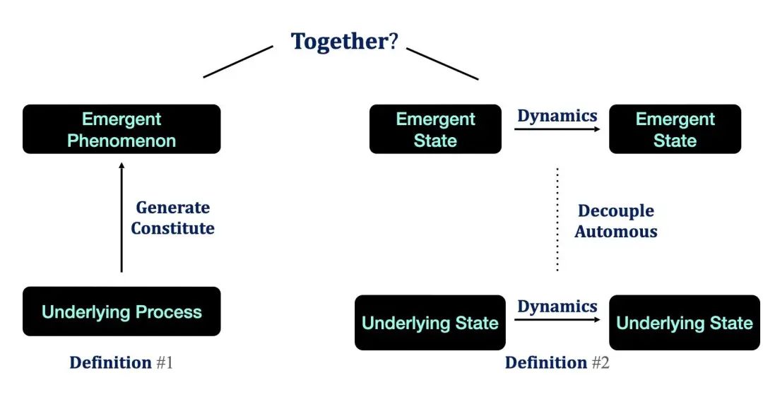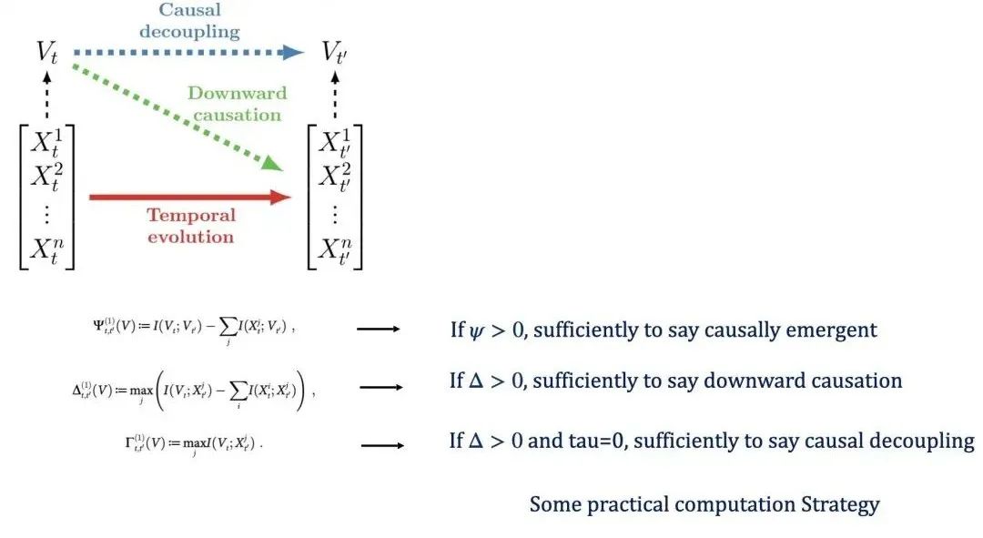 但由于参与涌现这一概念研究的科学家背景繁多,所以在不同文献里涌现并没有一个统一定义,或者对于科学研究来讲尤其重要的是,一种能量化涌现的计算框架。而这一科学诉求就又可以回归到我们读书会所讨论的核心命题:因果涌现[4]。