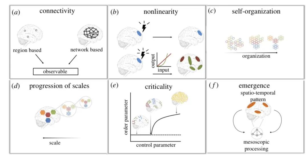 而意识这个概念或难题当然也是许多脑研究的核心问题,且随着人工智能多模态的各方面能力增长,其是否产生意识或者需要意识来达到通用人工智能也被越来越来多的讨论。在这种情境下,脑与涌现这个概念通过意识这个纽带被紧密联系在一起。这里可以抛砖引玉一下,以下的图是当我们探讨脑与涌现的联系却不通过意识[3],从脑活动的复杂连接、非线性、自组织、多尺度、临界态来说,脑活动本身也是一种涌现现象。