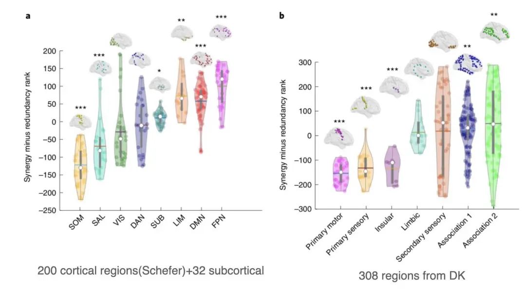 图8.两种分区方法下大脑不同子系统的协同与冗余排名的差