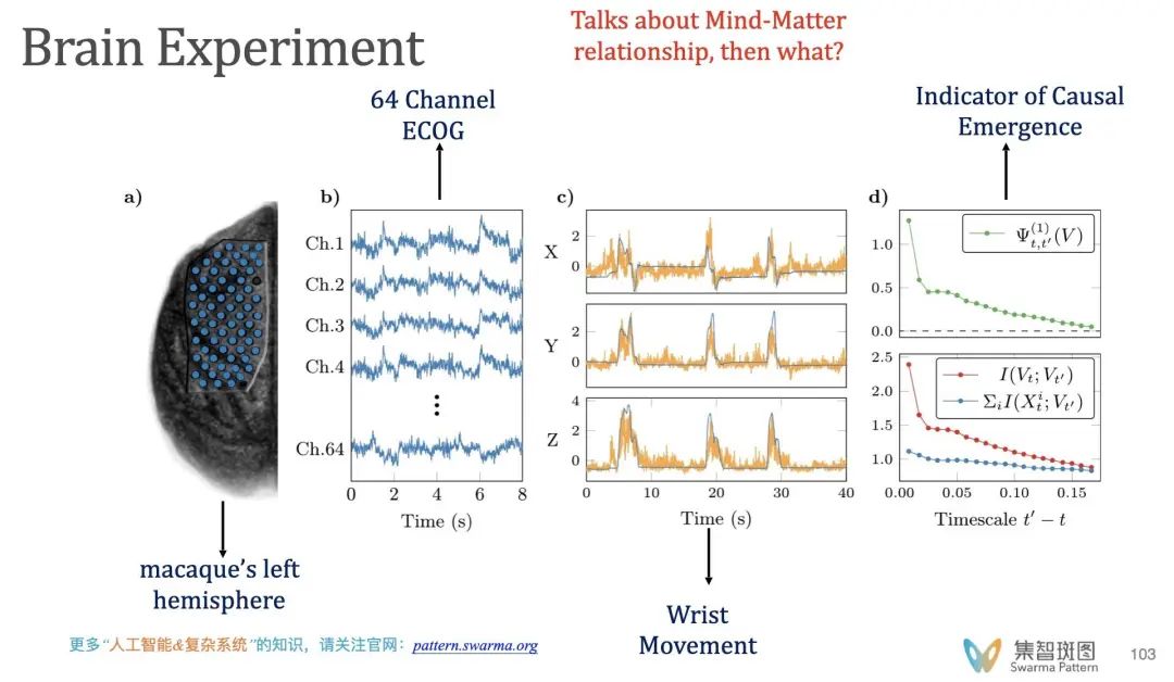 同样由于信息分解的计算局限性,这一定义也只能拓展到存在宏观变量的充分条件下。具体在脑实验的结果,便是使用猴在 motor task 的脑电数据当微观变量(X),脑电数据对猴腕部移动的最佳预测(V,为什么要去预测?是因为这样才能满足宏观变量对微观变量的依附性)作为宏观变量。通过充分条件可以发现因果涌现这个指标是能够为正的,这似乎解释了某种 mind-matter relationship,但然后呢?