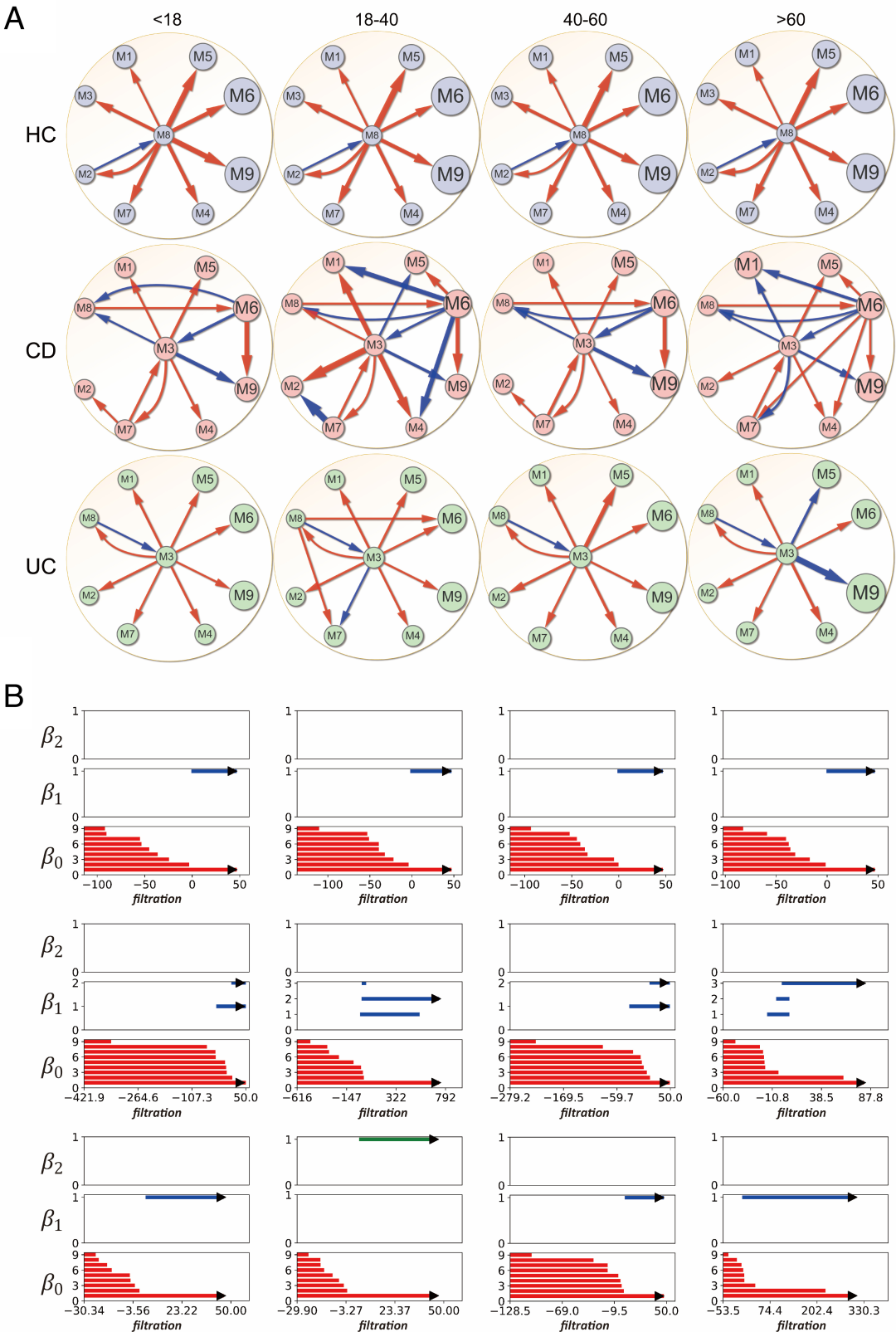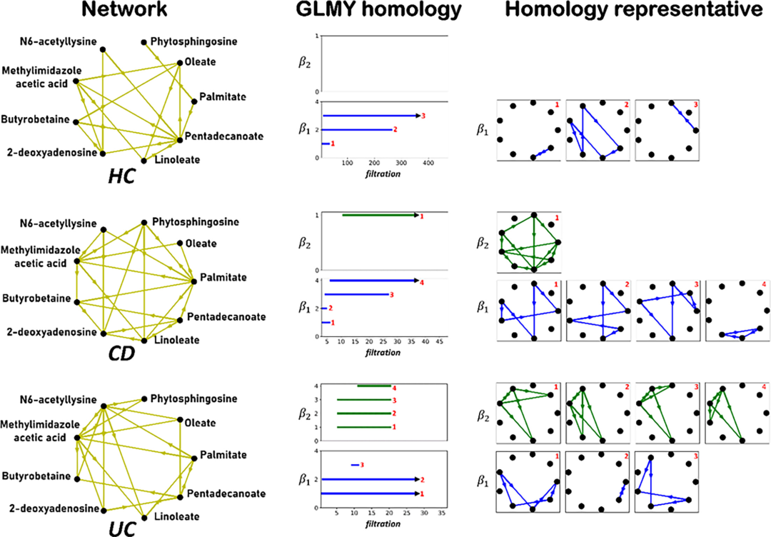 通过在0,1和2维度上根据 Betti 数(同调性秩)剖析代谢网络,考虑三组模块 M3的负边导出子网络(图4)。HC 和 UC 在第一维上各有三个孔(拓扑特征),但是这些拓扑特征在两组之间是不同的。
