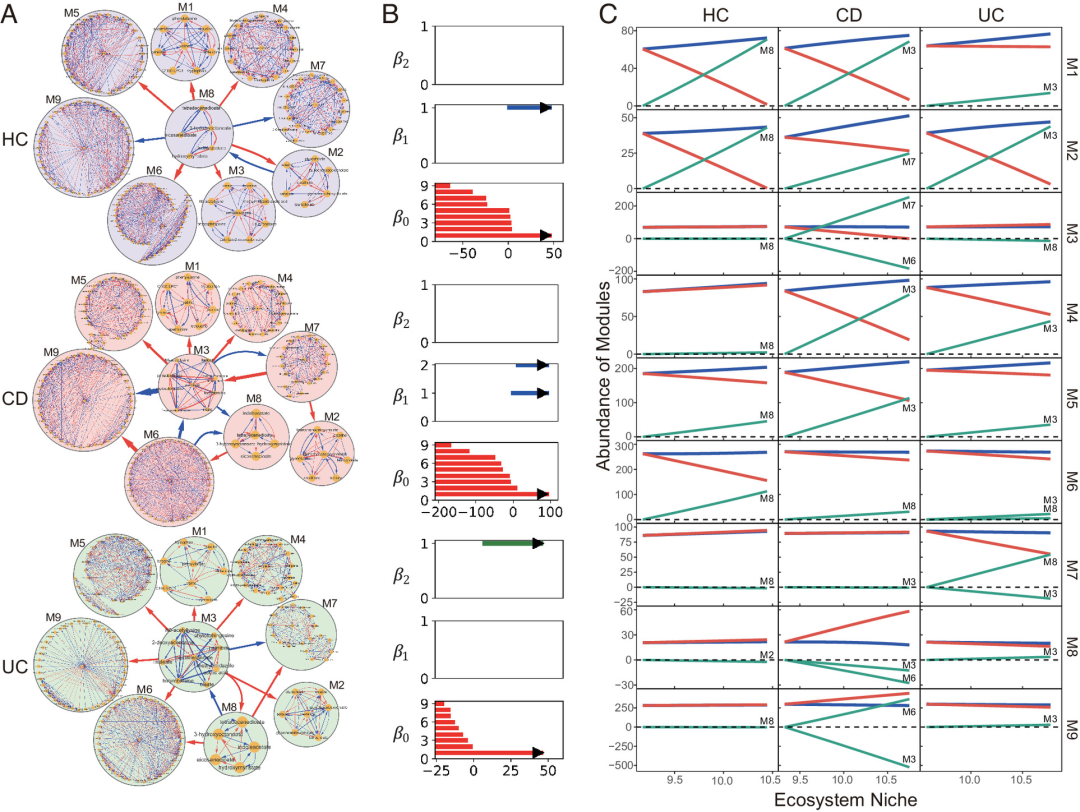 将UC,CD与对照三组分别构建网络后,分别进行功能聚类,每组可分为M1到M9等不同模块,使用来自每个模块的所有代谢物的总丰度水平和使用相同模块内的每个代谢物的丰度水平的细粒度网络重建粗粒度网络,形成每个组的两层代谢 bDSW 网络 (图1A),可发现健康人与炎症性肠病的代谢网络各自表现出特定的组织结构。