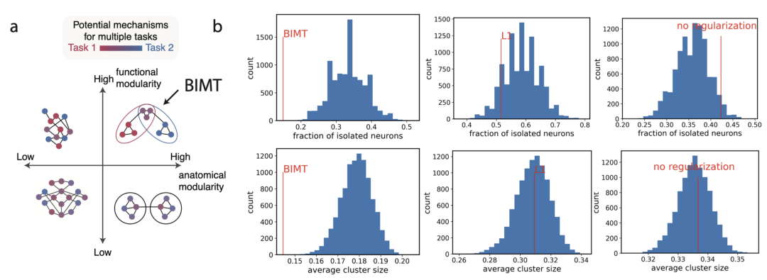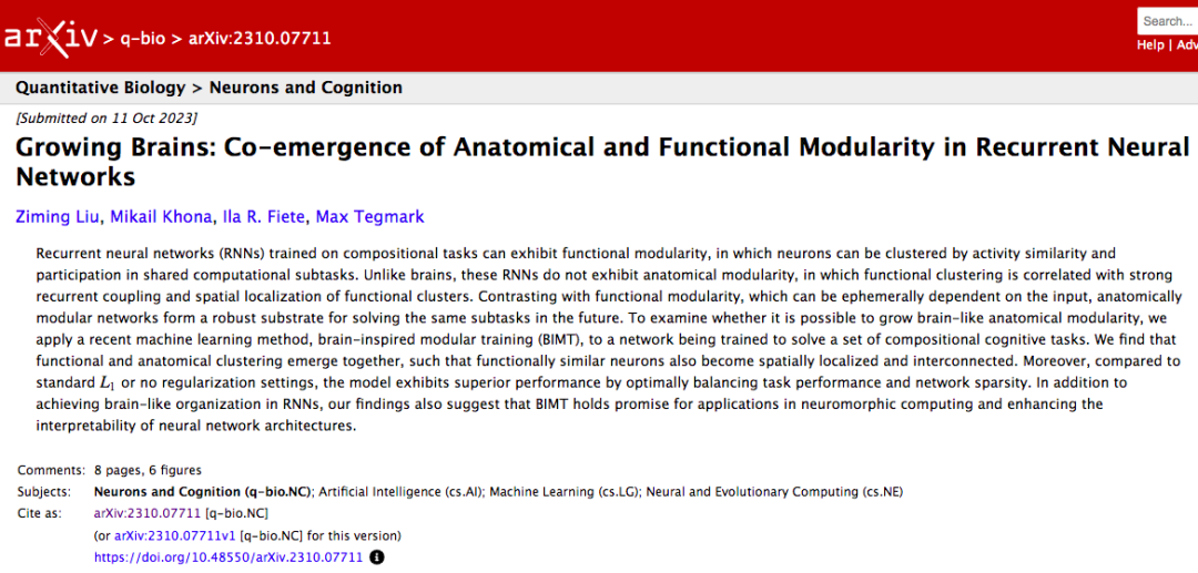 为了检查是否可能生长出类似于大脑的解剖学模块化,这项研究将最近的机器学习方法——大脑启发的模块化训练(brain-inspired modular training,BIMT),应用于正在训练以解决一组组合认知任务的网络。结果发现,功能聚类和解剖学聚类一起涌现,使得功能相似的神经元也变得空间局域化和互相连接。