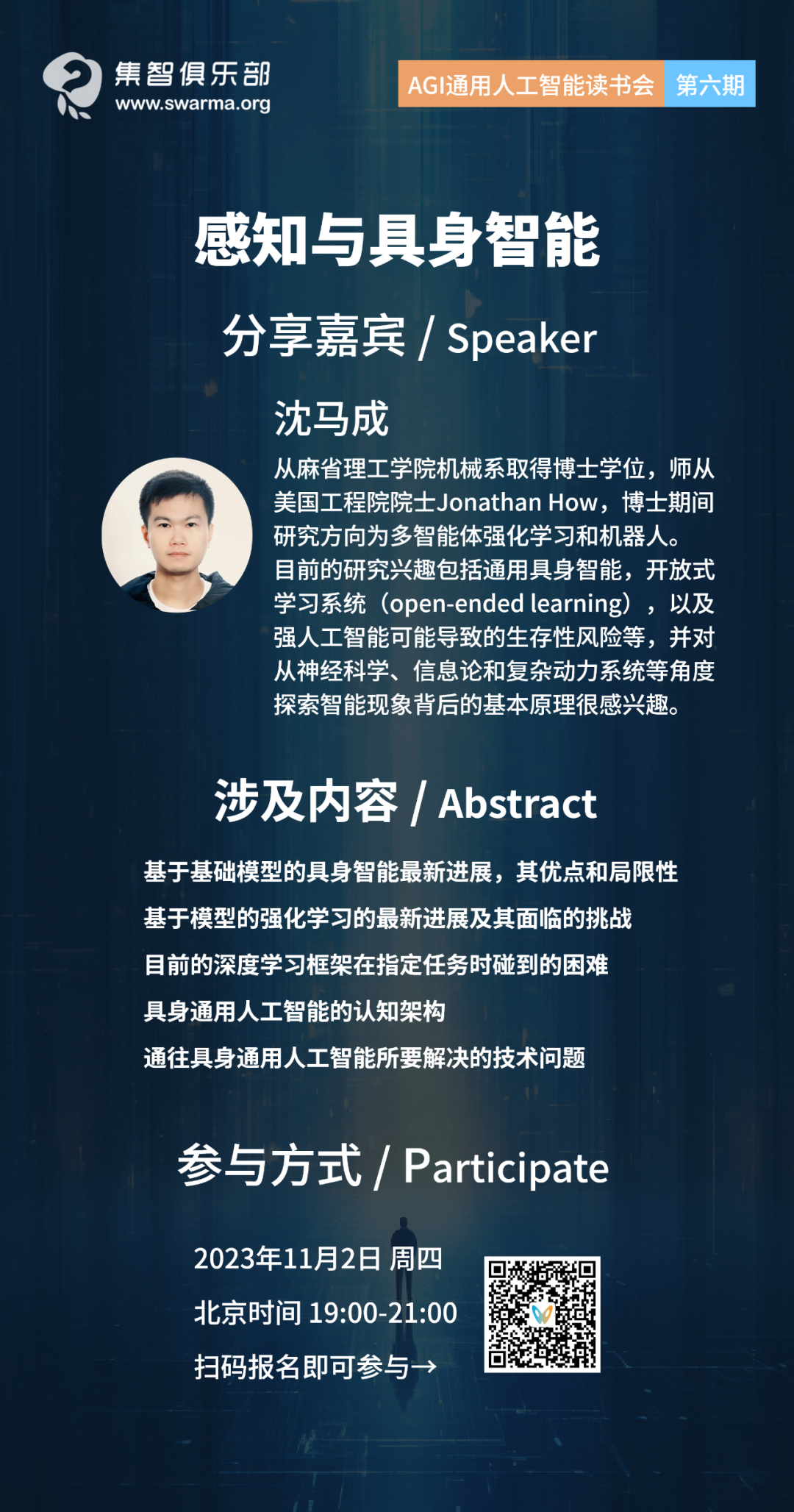 本次读书会是系列读书会的第六期,将由来自麻省理工学院的沈马成博士对于感知与具身智能进行分享。