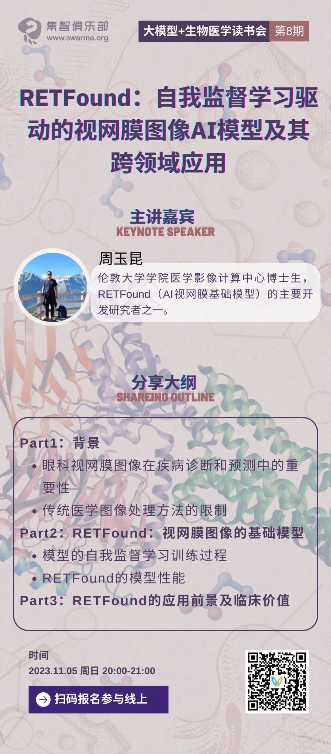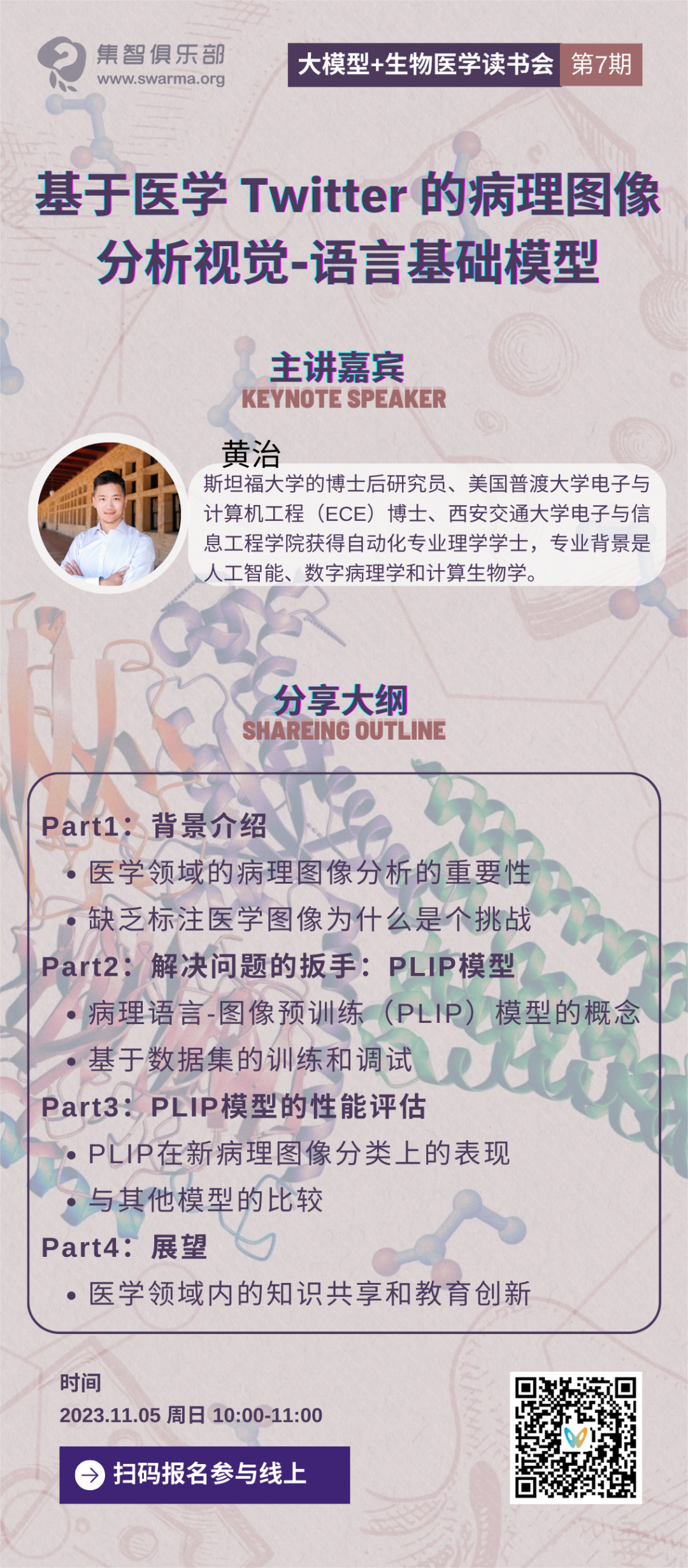 医学领域正面临着一个重大挑战:缺乏可用的标注医学图像,而这个问题限制了计算研究和医学教育的创新。另一方面,医学人工智能在视网膜图像分析方面也具有广泛的应用前景。但开发这些模型需要大量标注数据,通常限定于特定任务。本周的分享我们邀请了两位嘉宾,来自斯坦福大学的博士后黄致将会为大家介绍「基于医学 Twitter 的病理图像分析视觉-语言基础模型」,时间是本周日上午10:00-11:00;来自伦敦大学学院(UCL)和Moorfields眼科医院在读博士周玉昆将会为大家介绍「眼科视网膜基础模型RETFound」,时间是本周日的晚上20:00-21:00,欢迎大家关注。