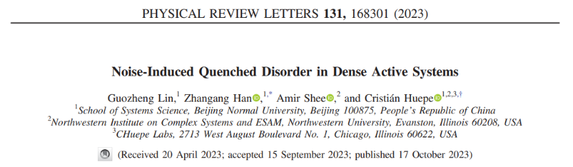 近期,Physical Review Letters 期刊发表了题为“Noise-Induced Quenched Disorder in Dense Active Systems”的论文(如图1所示),发现由相互排斥的个体组成的密集集群系统能够产生一种新的淬火无序态 (Quenched disorder),该状态展现出短程的有序和长程的无序,与在复杂系统中被长期研究的自旋玻璃态类似。该论文以北京师范大学系统科学学院为第一单位,由系统科学学院韩战钢教授作为通讯作者、林国政博士作为第一作者,联合了美国西北大学的 Cristian Huepe 研究员(共同通讯作者)和Amir Shee 博士后,于 2023 年 10 月 17 日上线于 Physical Review Letters 期刊官方网站。