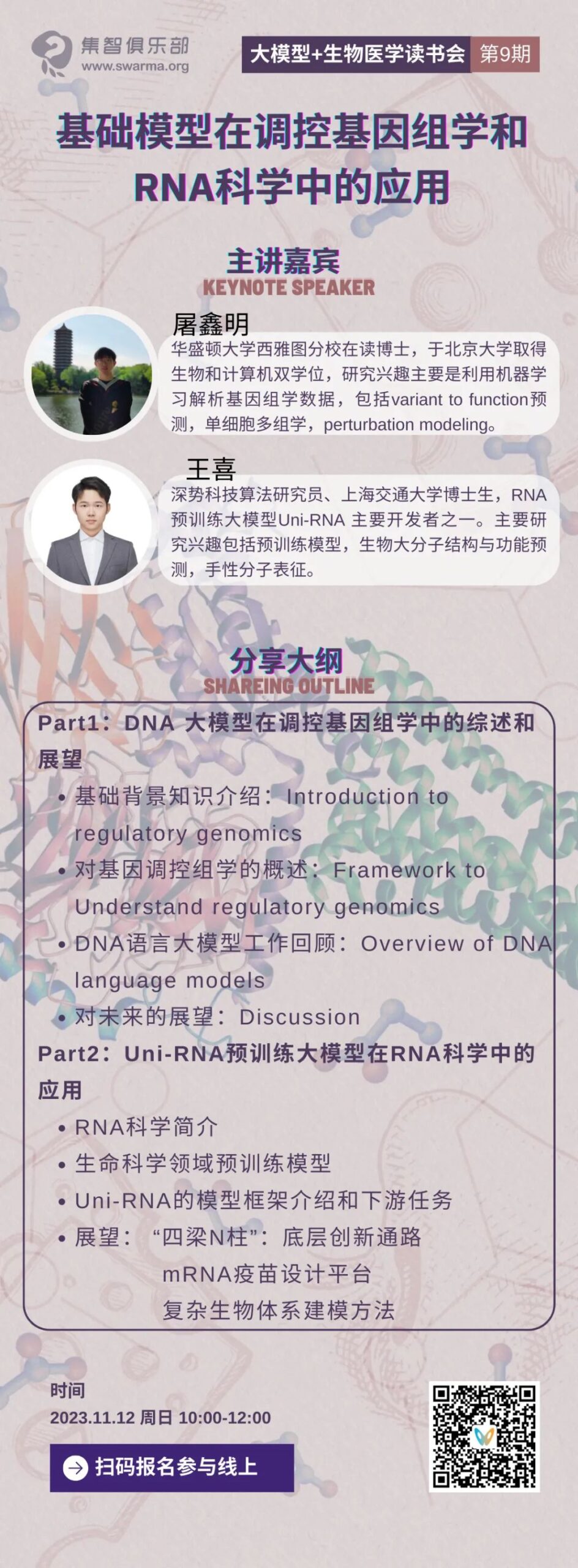 对于DNA而言,不论调控基因组学与蛋白和其他调控分子多么相关,它始终作为调控基因组学的研究核心。故而,在本周日上午10:00,我们将由屠鑫明老师带领我们回顾深度学习在这个方向的应用,同时探讨DNA大模型在基因调控中的潜在应用以及目前工作的一些局限性。与此同时,由于RNA分子和其相互作用的复杂性,RNA科学的发展一直相对较慢,缺乏系统性的理解。幸运的是,Uni-RNA提出了规模最大的RNA序列预训练模型,从而针对性地解决了部分RNA研究中的问题。因此,在本次分享会中,将由王喜老师带领我们介绍Uni-RNA,并展望未来RNA科学的研究方向。