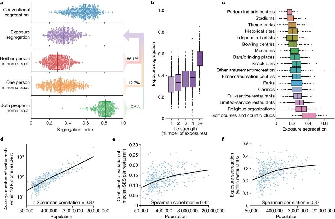 图2:上图,与传统的隔离指标——邻里分类指数相比,大城市的接触隔离度低 38%。(b)或特定地点类型(c)出现的接触对的隔离情况。方框表示各 MSA 的四分位数范围。随着联系强度的增加,隔离度也随之增加,尤其是联系强度最大的地区。高尔夫球场和乡村俱乐部的隔离度最高,表演艺术中心和体育场的隔离度最低。(d-f) 对全方位服务餐厅的案例研究说明了城市化与接触隔离度之间的关系。人口稠密的大都会区的隔离程度更高,这不仅是因为它们提供了更多的场所选择,还因为这些场所的社会经济差异更大。