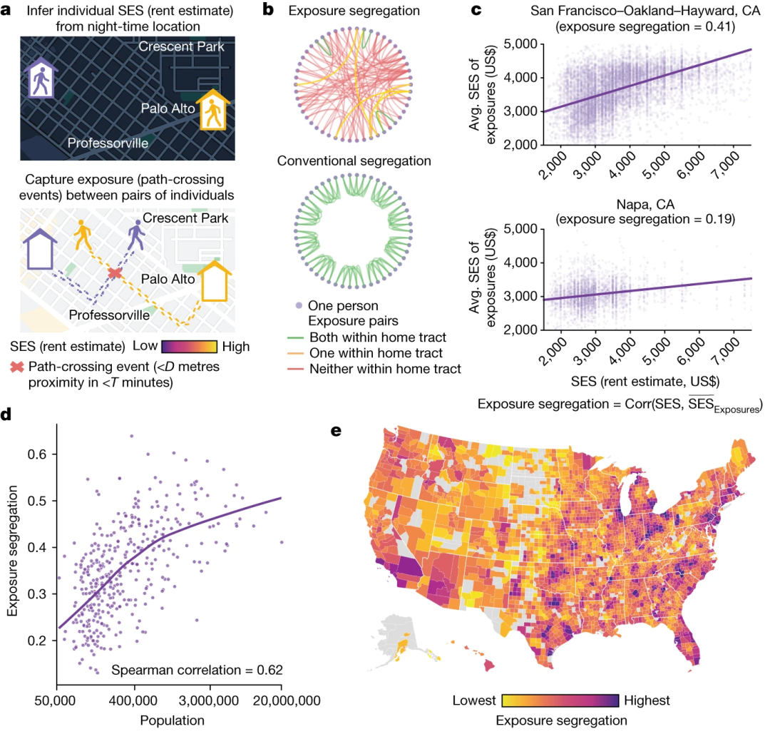 图1 (a) 对于 960 万人的手机数据,根据他们在夜间的位置,从家庭住址推断他们的社会经济地位(房租或房租等价物)。然后捕捉路径交叉事件(即在同一时间出现在同一地点),以确定相互接触的个人对。(b) 全国范围内的 16 亿次接触网络覆盖 2829 个县和 382 个市辖区。(c) 对于每个地理区域(MSA 或县)估算隔离程度,定义为个人的社会经济地位与与其有交集的人的平均社会经济地位之间的相关性;1 表示完全隔离,0 表示无隔离。这一定义等同于传统的邻里分类指数,但主要区别在于它利用了流动数据中的真实接触,而不是按人口普查区分组的个人合成接触。我们展示了两个大都会区的原始数据;每个点代表一个人。(d) 接触隔离度是人口规模的函数;每个点代表一个大都市区;向上的斜率表明,城市化与更高的接触隔离度相关。(e) 美国 2,829 个县的接触隔离情况。