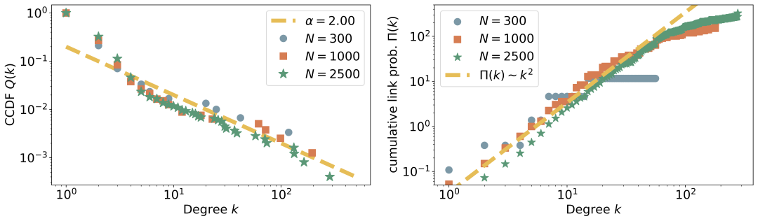 我们的生成式主体模型反映了在Barabasi-Albert模型中所观察到的规律,即当优先连接指数μ大于零时,度分布从指数型逐渐演化为更广泛的概率分布,最终在μ>1的情况下,形成富者愈富的局面。我们的目标是确定由我们的生成式主体产生的网络归属于哪种模式(拉伸指数随机网络、无标度网络,或中心-辐射网络)。图3(左)展示了随着网络增长至N=2000个节点,节点度的互补累积分布函数的演变情况。在双对数坐标中,互补累积分布函数的线性趋势表明了无标度的拓扑结构。图中的实线代表了对互补累积分布函数的最大似然拟合[31, 32],对应于一个指数α=1.93±0.12的幂律度分布。