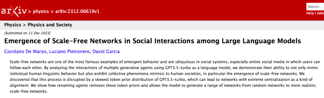 对孤立的大语言模型行为的研究,虽然富有启发性,但对这些模型在更为复杂、交互性的环境中的隐动力学(potential dynamics)只能提供有限的视角。在人类社会中,许多最重要的过程和现象并非单个行为的产物,而是集体行为的结果。例如,文化趋势、经济转变和社会运动,都是众多个体相互作用的涌现性质的体现,通常以复杂且难以预测的方式出现[17]。大语言模型是生成式主体概念的核心部分:将大语言模型与其他结构和属性(如记忆、计划和身份)结合,对人类行为进行建模[18,19]。当多个生成式主体在模拟环境中互动时,它们可能展现出无法预测或并未直接编码在任何单一主体或大语言模型中的行为,以及产生出预料之外的结果[20]。这些情况源于多个主体及其大语言模型之间的复杂相互作用和依赖关系。从某种意义上讲,每个生成式主体都为一种更为复杂且难以预测的集体“智能”或模式做出贡献,这种智能或模式比其个体能力所能暗示的要复杂得多。例如,使用生成式主体进行的模拟显示了信息扩散和协调等涌现行为的实例[18]。