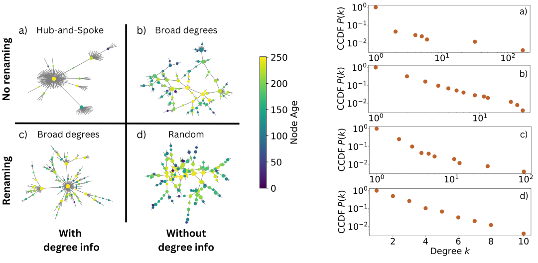 图2:网络拓扑结构。左图:展示了主文中讨论的四种情况对应的不同网络拓扑结构:Token先验的存在/缺失,以及主体界面中度数的存在/缺失。颜色反映了节点的年龄,而节点的大小则与度数的对数成比例。右图:四种不同网络拓扑结构的互补累积分布函数(Complementary Cumulative Distribution Functions,CCDF)。