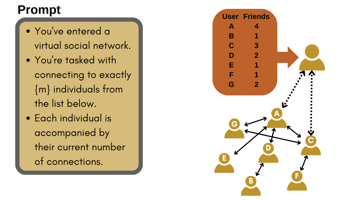 图1:基于大语言模型的生成式主体网络生长。左图:我们用于初始化每个生成式主体的大语言模型,使其作为在线社交网络的用户的提示(promot)。该提示后接一个详尽的列表,列出了所有网络用户及其朋友数。右图:模拟过程的示意图。在每个时间步,新的主体使用给定的提示进行实例化,并接收现有网络用户的度信息。然后,主体确定它希望连接的m个用户,并更新网络以包括这些新的连接。随着新主体的加入,这个迭代过程持续进行。