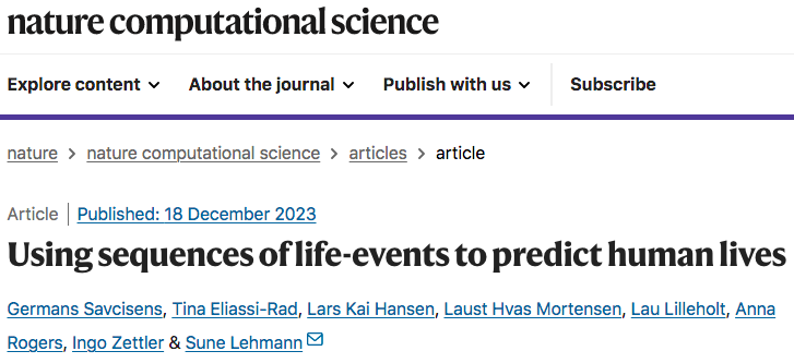近日发表于 Nature Computational Science 的最新论文表明,如果使用大量有关人们生活事件的数据训练类transformer模型life2vec,可以系统地组织数据,预测一个人一生中将发生的事情,甚至估计死亡时间。