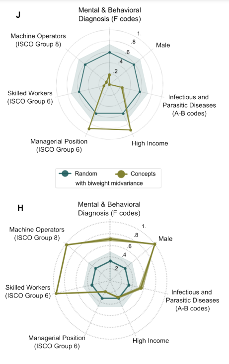 利用可解释深度学习模型的方法,可对算法进行深入探究,以了解促成预测的因素。影响life2vec预测的因素与现有的社会科学研究成果相一致。例如,在所有条件相同的情况下,担任领导职务或收入高的人更有可能存活(图4J),而男性、技术工人或患有精神疾病的人死亡风险更高(图4H)。
