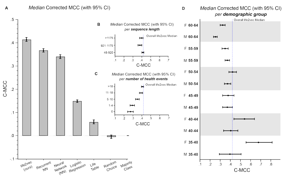life2vec 模型展示了预测人格特质和死亡率等结果的非凡能力,模型表现优于其他先进的神经网络。