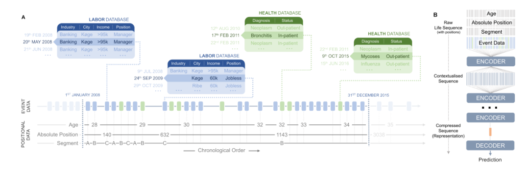 通过对 600 万丹麦人的大量健康和劳动力市场数据进行分析,模型将人的一生视为一长串事件,就像语言中的句子由一系列单词组成一样。该数据集包括与健康、教育、职业、收入、住址和工作时间相关的生活事件信息,并以每日的分辨率进行记录。而训练后的模型可决定将有关出生时间、就学、教育、工资、住房和健康的数据置于何处。