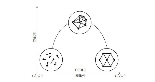 而处在中间的系统,单个元素可能做不同的事情,但其中有一定程度的协调,使系统在某种程度上“作为一个整体”运行。这是可以同时找到整合性和信息性的领域。它也是介于有序与无序之间的中间地带,正因为如此,系统才“复杂”。