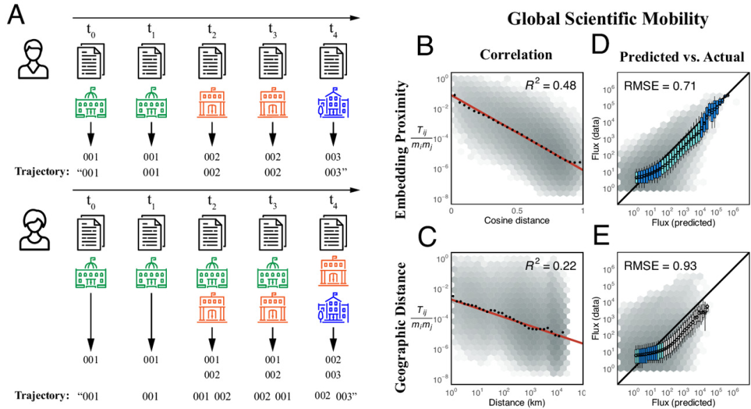 图1:神经嵌入提供了功能距离,在三个不同的人类轨迹数据集上提高了移动引力模型(gravity model of mobility)的最佳预测能力。(A) 为每个组织分配了一个唯一标识符,并将它们组合成一个按发表年份排序的隶属关系轨迹(顶部)。如果一位作者在同一年列出了多个机构的隶属关系,我们会在每次训练迭代中调整该年的顺序(下图)。(B)与地理距离相比,嵌入距离能更好地解释全球科学迁移的预期流量(C)。红线为最佳拟合线。黑点为分段距离的平均通量。(D) 使用嵌入距离对机构间流量的预测优于使用地理距离(E)对机构间流量的预测。