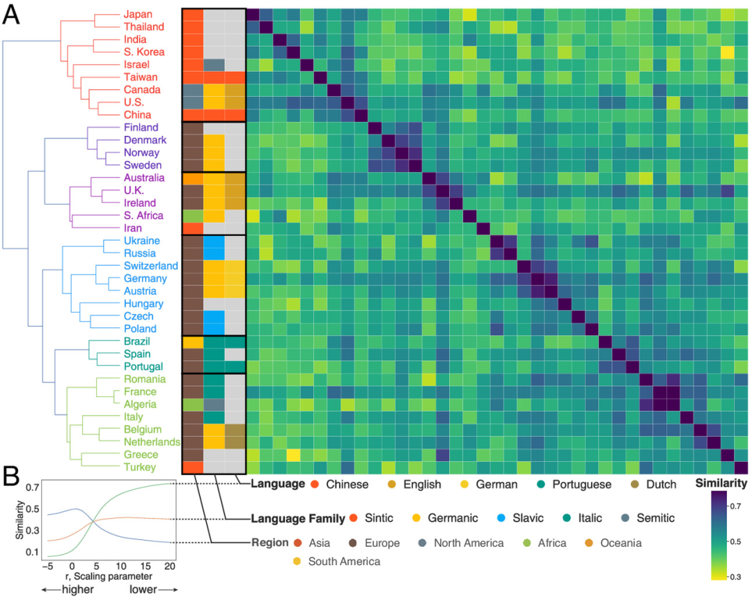 图3:国际移徙的条件首先是地理因素,然后才是语言因素。(A) 国家向量的分层聚类相似性矩阵,其中的值为至少有 25 个组织的国家内所有组织向量的平均值。矩阵单元的颜色与国家向量之间的余弦相似度相对应。国家名称的颜色与其群组相对应。从左至右,矩阵中分隔的三个单元列的颜色分别对应国家的地区、语系(65)和主要语言。(B) 以元素为中心的聚类相似性揭示了决定层次聚类的因素。地区能更好地解释国家矢量在较高层次聚类中的分组情况。语系,然后是使用最广泛的语言,能更好地解释国家的细粒度分组。
