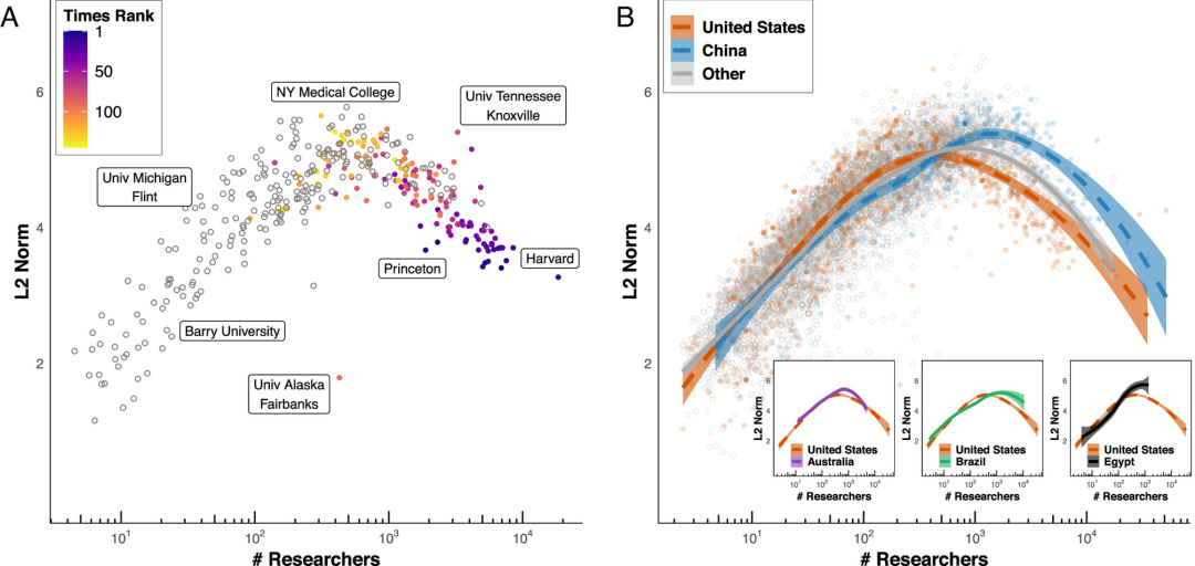 图4:组织嵌入向量的大小反映了组织的声望和规模。(A) 组织嵌入向量的大小与美国大学研究人员数量的比较。颜色表示大学在《泰晤士报》排名中的名次,1 表示排名最高的大学。未着色的点为未列入《泰晤士报》排名的大学。我们发现了一个凹形,即规模较大的大学往往离原点更远;然而,声望较高的大学的 L2 Norm往往较小。(B) 我们在美国、中国、澳大利亚、巴西等许多国家发现了类似的凹曲线模式