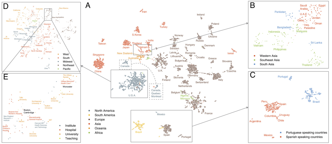 图2:嵌入空间的投影显示了各组织复杂的多尺度结构。(A) 嵌入空间的 UMAP 投影(显示了国家层面的聚类。每个点对应一个组织,其大小表示 2008 年至 2019 年隶属于该组织的移动和非移动作者的年平均人数。颜色表示地区。(B) 放大(重新投影)包含西亚、南亚和东南亚国家的区域,显示出国家集群的地理和文化梯度。(C) 同样,放大到包含西班牙、葡萄牙、南美洲和中美洲组织的区域,显示出按最广泛使用的多数语言群组进行的聚类:西班牙语和葡萄牙语。(D) 对美国的组织进行同样的放大,可以看到以州为单位的地理聚类,大致按人口普查局指定的地区进行分组, (E) 进一步放大马萨诸塞州,可以看到以城市中心(波士顿、伍斯特)、组织部门(医院与大学)以及大学系统和声望为单位的聚类